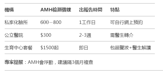 AMH檢測:每年1次(私家診所600?800)